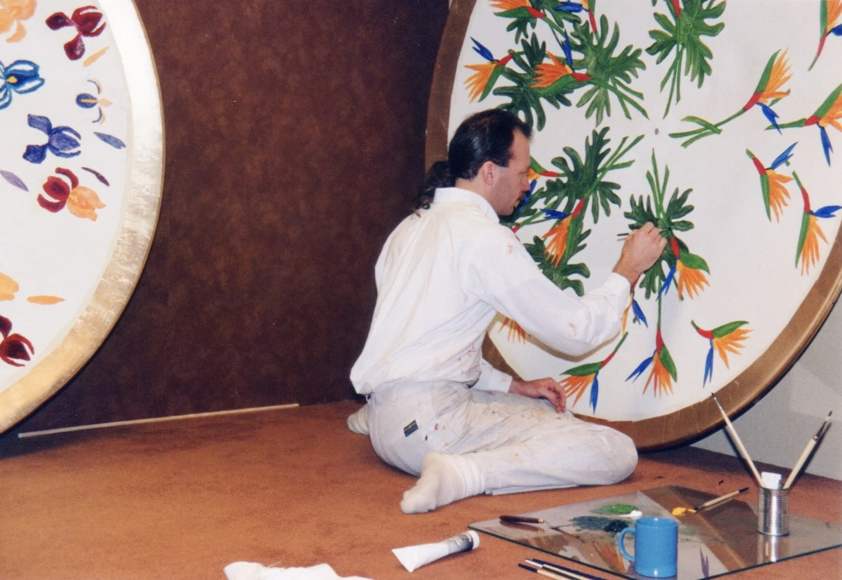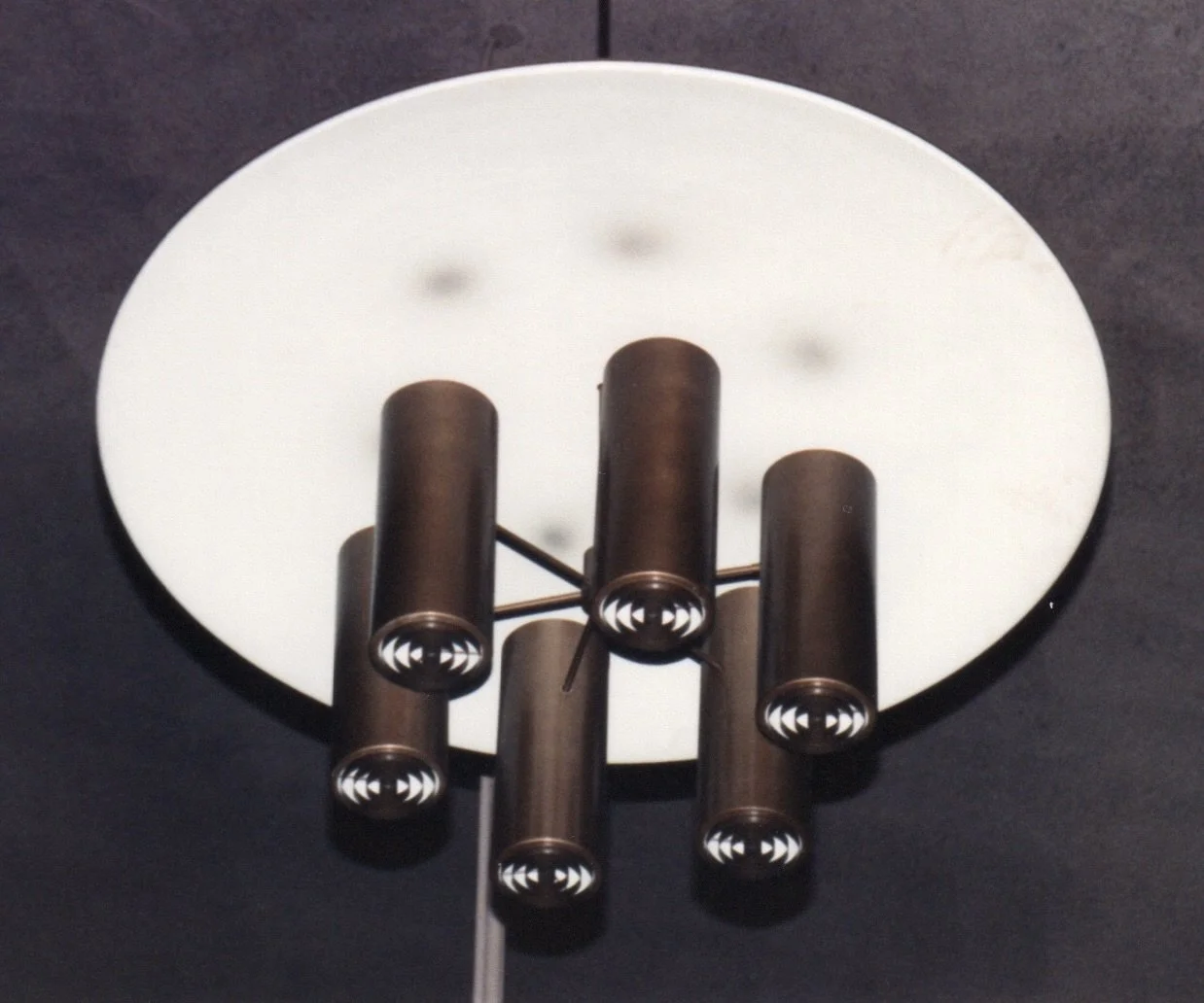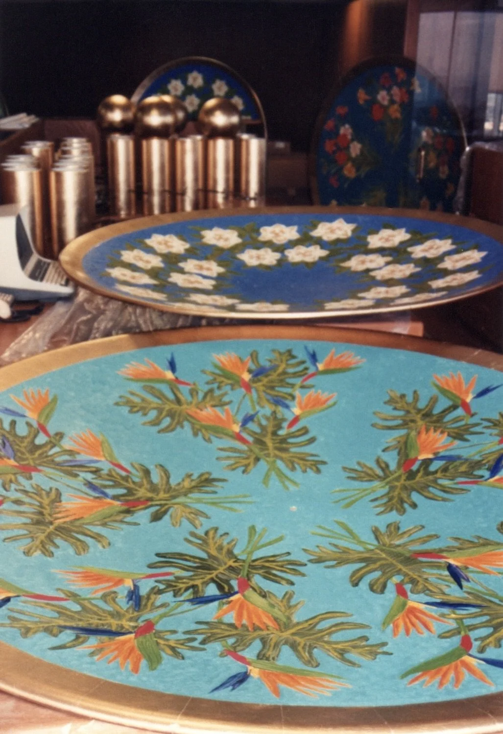These gondola looking light fixtures were chosen for painted decoration at this theatre-in-the-round in Houston, TX. It is a domed space completely sprayed with acoustical texturing on both the dome and the walls, so the light fixtures were chosen for painted decoration and metal leafing, flower bouquets were chosen for adding color to the space.