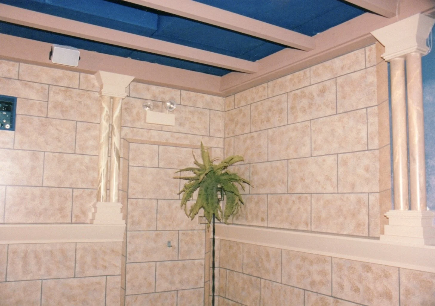 This project involved a re-design of a store front space that fronted a 1920’s movie theatre. In doing so it became a second theatre space to the original. The “atmospheric” design concept of the original theatre was chosen for the new space, therefore coordinating. Here I created two trompe l’oeil windows that flank each sidewall of the movie screen on a background of faux fresco, the proscenium arch itself is decorated with pilasters made from salvaged plasterwork of the demolished Granada Theatre, repaired and then polychromed. The remaining wall spaces were given a faux stone block design and faux marble columns. An interesting aspect to this project was to create exaggerated contrast of the paint colors so that they would show correctly in a low light setting”.